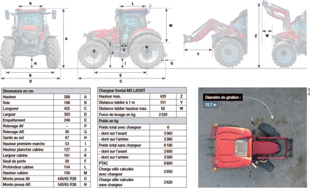 Le Case IH Vestrum 120 pèse 6,75 t avec le réservoir rempli au tiers de sa capacité et des masses de 150 kg dans chaque roue arrière. Le tracteur présente donc une parfaite répartition 50/50 avec 3,36 t sur l’essieu avant et 3,36 t sur l’essieu arrière. Sans son chargeur L4020T, il ne pèse plus que 6,18 t pour une répartition avant/arrière de 2,60 t/3,58 t, soit 42 %/58 %. Sa cabine offre un accès par un seuil de 35 cm. Enfin, l’empattement du tracteur est de 2,49 m pour un diamètre de giration de 12,70 m dans sa configuration.