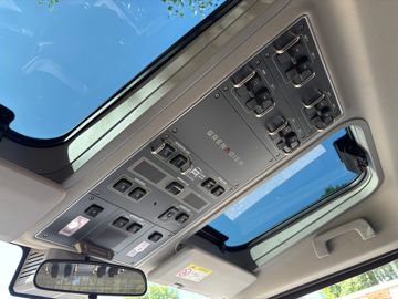 Le plafonnier de cabine donne l’impression de se trouver dans un cockpit d’avion. Il permet de gérer les blocages de différentiel avant/arrière, les modes de conduite, les assistances, différentes sorties électriques pour des accessoires, ainsi que l’éclairage auxiliaire.