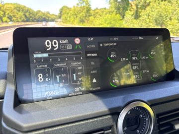 Un écran prend tout de même place sur la droite pour toutes les informations du véhicule : rapport de transmission engagé, vitesse, régime moteur, etc. L’intégration pour les smartphones avec Apple CarPlay et Android Auto est de mise, ce qui est très appréciable à l’usage, que ce soit pour la musique ou la navigation. Je regrette simplement que l’écran ne soit pas légèrement incliné vers le conducteur, certainement pour correspondre à un poste de conduite aussi bien à droite qu’à gauche. L’affichage off-road permet de visualiser en temps réel la température et la pression des pneumatiques, ainsi que la température de l’huile et des boîtes de vitesses et de transfert. D’autres informations plus « gadgets » pour une utilisation agricole, comme le degré de tangage ou de roulis, l’angle de volant ou encore l’altitude, sont disponibles.