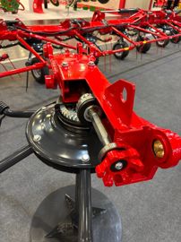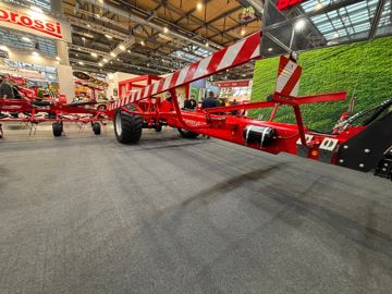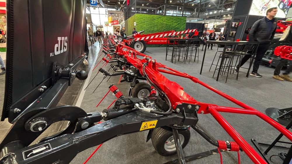 SIP commercialisait jusque-là une faneuse de 14 toupies travaillant sur une largeur de 15 m. Sur le salon Agritechnica 2025, le Slovène présentait un modèle de 16 toupies en version semi-portée sur chariot sous le nom de Spider HD 1700/16 T, machine devenant de fait la plus grande de son offre. Cette faneuse bénéficie d'une largeur de travail de 17 m, et ses 16 toupies, de 1,45 m de diamètre, supportent chacune six bras. Selon SIP, les rotors segmentés et indépendants permettent une parfaite adaptation au sol. Comme ses petites sœurs, la Spider 1700 se déploie hydrauliquement, et un imposant vérin assure son relevage en bout de parcelle. Le réglage breveté de la distance entre les dents et le sol est hydraulique. Le piquage des toupies, quant à lui, se règle toujours mécaniquement, avec une plage d'angles allant de 13° à 21° selon la quantité et l’humidité du fourrage. Les Spider sont dotées de la connectivité Isobus pour un contrôle simplifié depuis la cabine des tracteurs compatibles.