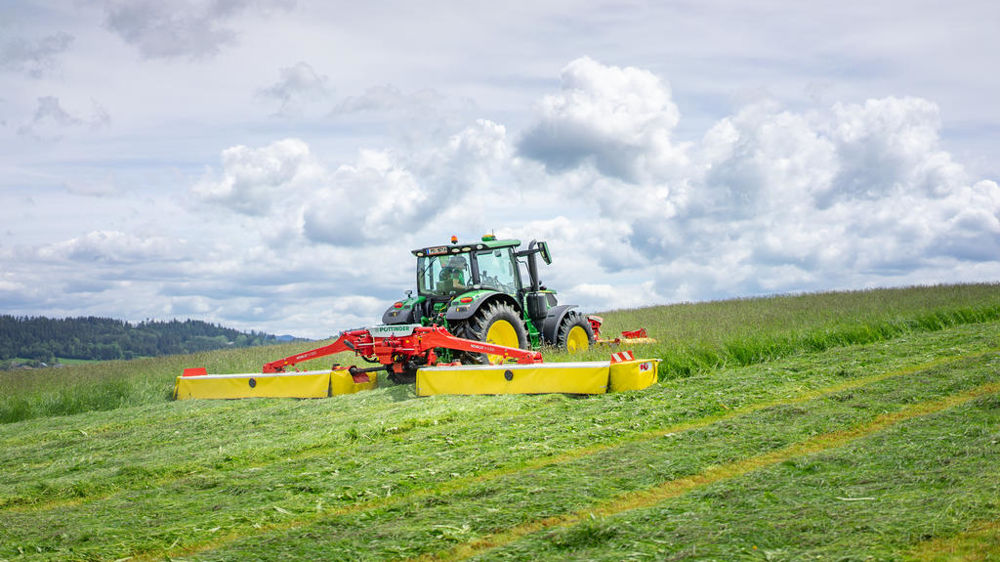 Pöttinger dévoile ses combinés de fauche Novacat H 9500 et H 11200, respectivement de 9,46 et 11,14 m de largeur de travail. Ces derniers remplacent les modèles Novacat S10 et S12. Ils conservent le lamier de leurs prédécesseurs de 4 cm d’épaisseur pour une profondeur de caisson de 28 cm. Leur fixation pendulaire leur offre un débattement de 22,5° pour un bon suivi du sol. La suspension hydraulique qui équipe ces modèles assure une pression au sol constante sur toute la largeur du lamier. Le boîtier central en « T » des Novacat H dotés de transmissions latérales longues garantit, selon le constructeur, un entraînement performant et silencieux. En cas d’obstacle, ces combinés de fauche pivotent vers l’arrière. Ils peuvent se replacer en position de travail à l’aide du distributeur hydraulique pour éviter au chauffeur de descendre de la cabine.