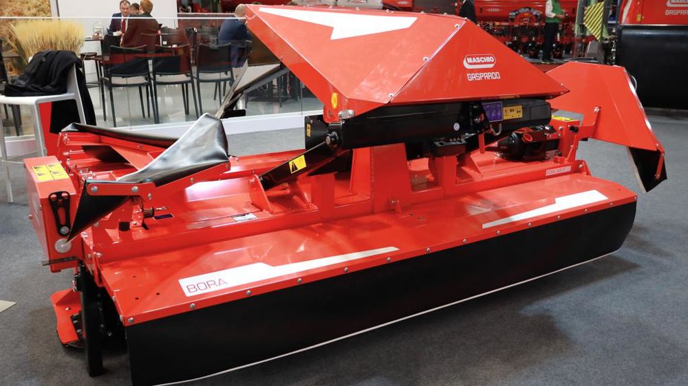 La marque italienne Maschio Gaspardo, qui sous-traitait auparavant la production de ses faucheuses frontales, fabrique désormais ses propres modèles, baptisés « Bora F ». Ceux-ci se déclinent en largeurs de travail de 2,96, 3,11 et 3,52 m, et se dotent respectivement de 14, 16 et 18 couteaux. La largeur de l’andain, pour sa part, se règle de 1 à 2,80 m.