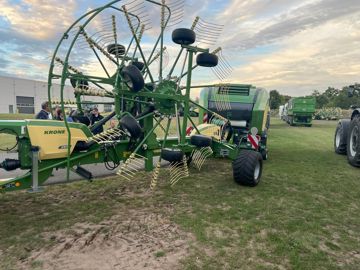 Krone dévoile un andaineur taillé pour être combiné avec une presse de la marque. Puisque sa mission est de regrouper le fourrage en andains, mais aussi de guider l’ensemble long de 18,75 m, tracteur compris, dans les passages de roues de ce dernier, cet andaineur spécial, baptisé « Swadro BaleTrain TC 880 Pro », reçoit quelques adaptations. S’il repose sur le concept à double rotor et à dépose centrale « Swadro » de la marque, d’une largeur de ramassage maximale de 8,80 m, son attelage, sa cinématique et son essieu sont cependant modifiés. La prise de force du tracteur, d’abord, est reliée à une boîte de vitesses. Celle-ci transfère le mouvement vers les rotors de l’andaineur dans un premier temps, mais dissimule aussi dans la poutre centrale du châssis un arbre. Ce dernier transmet dans un second temps le mouvement entraînant la cinématique du combiné presse-enrubanneuse ou d’une presse de la marque. La boîte de vitesses dédiée aux rotors permet de démultiplier le régime de rotation. Les rotors de l’andaineur peuvent ainsi tourner selon deux régimes de rotation réglables manuellement (400 ou 540 tr/min), tandis que la presse recevra toujours le régime de 540 tr/min distribué par le tracteur. L’andaineur est en outre attelé au tracteur par une configuration Scharmüller de type K80, ainsi que par une boule K50. Cette dernière a pour but de piloter l’essieu suiveur précédant la presse pour guider l’ensemble dans les passages de roues du tracteur. Enfin, la barre de direction de l’essieu longeant la poutre est pourvue d’un vérin hydraulique afin de le piloter manuellement pour faciliter certaines manœuvres de marche arrière ou en entrée de parcelles notamment.