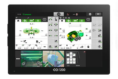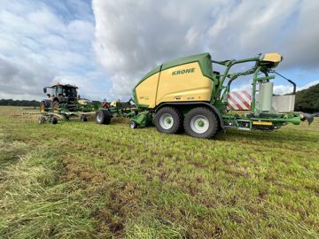Il faut être clair, un tel ensemble nécessite un peu de concentration pour être manipulé. Toutefois, afin de faciliter le pilotage, Krone offre au chauffeur des automatismes grâce à l’Isobus. Le relevage et la descente du pick-up et des rotors de l’andaineur en fourrière sont autonomes de façon à limiter le nombre de manipulations. L’ouverture de la porte, le déclenchement du liage ou de l’enrubannage pour les combinés, et le déchargement de la balle sont eux aussi déclenchés sans intervention du chauffeur. Autre assistance et non des moindres, l’essieu suiveur hydraulique est intelligent. Comprenez que celui-ci ne se contente pas de suivre le tracteur. Il dirige automatiquement la presse à gauche ou à droite de l’andain pour obtenir un remplissage homogène de la balle et donc une forme aussi parfaite que possible. Ceci est permis grâce à l’information communiquée par la presse, matérialisée habituellement sur son écran mais désormais directement traitée par l’ensemble. En plus de ces automatismes, Krone propose à présent, comme pour le reste de ses outils, une nouvelle interface sur le terminal Isobus dans le but, d’après le fabricant, de gagner en ergonomie. Le chauffeur peut notamment surveiller à la fois l’andaineur et le combiné presse-enrubanneuse sur le menu principal.