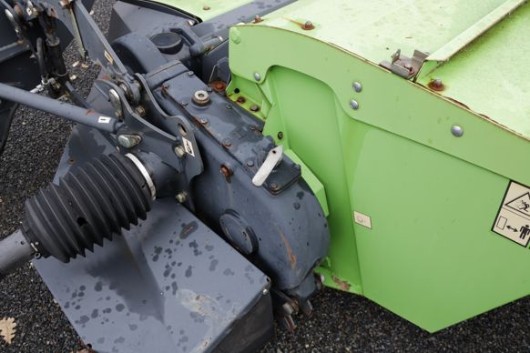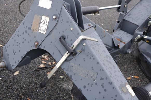 Le groupe lamier-conditionneur est suspendu au châssis par un bras et par un vérin hydraulique assurant la suspension et le relevage en bout de champ. Sur le côté gauche, deux bielles horizontales, formant un parallélogramme, assurent le maintien de l’assiette du lamier par rapport à l’attelage. Une dernière biellette, placée en diagonale, empêche le groupe de fauche de naviguer librement de droite à gauche. L’ensemble de ces articulations compte des rotules nécessitant un graissage régulier. Assurez-vous qu’elles en ont toujours profité et qu’elles ne présentent pas de jeu. Si vous avez la possibilité d’accrocher la faucheuse à un tracteur, testez le bon fonctionnement de la suspension à boule d’azote en contrôlant sa pression sur le manomètre disposé au-dessus du lamier. En cas de défaillance de ce dispositif, la DiscMaster ne suivrait pas correctement les irrégularités du sol. Enfin, inspectez les vérins et les flexibles pour déceler d’éventuelles fuites d’huile. Veillez également à ce que le châssis ne présente pas de fissures, en particulier au niveau des soudures.