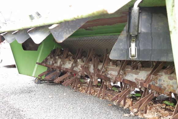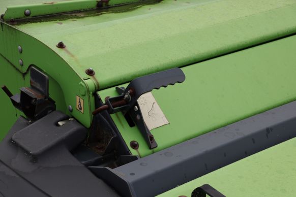 La DiscMaster 632T comprend un conditionneur à doigts. Celui-ci offre deux régimes de rotation, l'un en fonction du type de fourrage et l'autre de l’intensité de conditionnement recherché. La sélection entre les deux s’opère à l’aide d’un levier disposé sur le boîtier de transfert, entre l’entraînement du lamier et celui du conditionneur. Les doigts en acier arborent une forme en « V ». Leur fixation leur permet de s’effacer en présence d'un corps étranger. Vérifiez qu’ils ne sont pas tordus et qu’aucun ne manque à l’appel. Inspectez soigneusement leurs fixations. Si possible, faites tourner la faucheuse à plein régime. Ce test vous permettra de détecter des vibrations anormales, signe d’un mauvais équilibrage du conditionneur. Traquez également les fuites d’huile sur les boîtiers de transfert. Évaluez l’état d’usure de la tôle positionnée au-dessus du rotor. Des stries en bonne forme amélioreront l’efficacité du conditionnement. Enfin, manipulez les réglages de hauteur de cette tôle et ceux de position des déflecteurs à l’arrière.