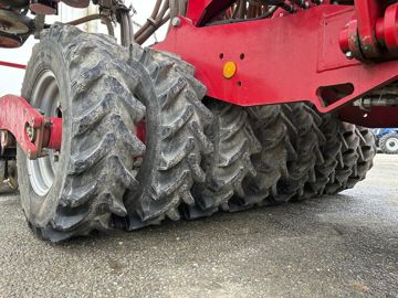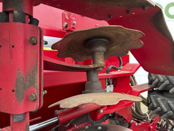 Les éléments les plus importants à vérifier sont les pièces d’usure, en commençant par les disques préparateurs : leur taille, leur crénelure plus ou moins importante et l’état des roulements. Leur jeu se constate facilement en les manipulant, tandis que leur usure s'évalue en les mesurant puis en les comparant à une pièce neuve. Si le renouvellement de certains éléments comme les socs des efface-traces ou les peignes reste abordable financièrement, celui des disques et de leurs roulements demande quant à lui un investissement plus important. Examinez également les boudins de sécurité en élastomère, qui peuvent s’altérer. Les crampons du profil agraire des pneus doivent eux aussi être contrôlés. Dans le cas du modèle d’occasion observé, ils devraient être changés pour un reconditionnement total. Afin de contrôler la dégradation des éléments semeurs, il est conseillé de jeter un œil à l’épaisseur des disques, puis de mesurer leur diamètre pour le comparer avec celui d'une pièce neuve. En tournant à la main l'un des deux disques, l'autre est censé être entraîné. Si ce n’est pas le cas, ces éléments devront être rapprochés à l’aide de cales de réglage, voire changés si l’usure est trop importante. Derrière, les roues plombeuses reçoivent un bandage en caoutchouc qui a tendance à se fendre, notamment en conditions pierreuses. Sur le modèle présenté, par exemple, le concessionnaire prévoit une révision se chiffrant, en incluant les pièces et la main-d’œuvre, à environ 10 000 €.