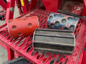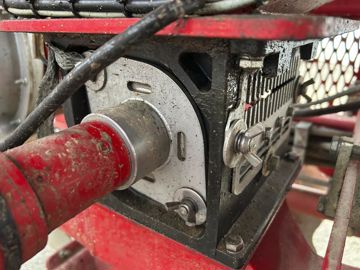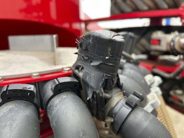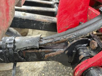 Sur toute occasion, l’état général du matériel en dit long sur son passé. A-t-il régulièrement dormi dehors ? A-t-il été bien entretenu ? Pour le savoir, observez l’esthétique globale de l’outil, dont la peinture sera plus ou moins passée selon sa fréquence d'exposition aux intempéries. Inspectez également l’état de la grille et celui de la peinture de l’intérieur de la trémie. Assurez-vous que la bâche au-dessus de celle-ci ne présente aucun trou. L’observation des tuyaux et des tubes de descente conduisant la graine, plus ou moins fendillés, est un autre repère pour savoir si le matériel était stocké ou non à l’abri. Si l’une de ces pièces a été changée, sa couleur sera probablement différente. Les coupures de descente électroniques, pour le jalonnage, peuvent témoigner d’une dégradation prématurée, à l’image du modèle observé, réparé avec du scotch et des riselans. Les flexibles hydrauliques sont sujets à craquèlement selon le lieu de stockage de l’outil, et du piquetage peut apparaître sur les tiges des vérins. Concernant ces derniers, pensez à surveiller de potentielles fuites au niveau des joints et de leurs raccords. D’autres éléments, comme un étançon ressoudé, témoignent du niveau d’utilisation du semoir.