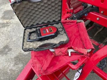 Testez l'état du système électrique, en lien avec le terminal en cabine. Contrôlez la présence de l’entièreté du faisceau, nécessaire à l’utilisation du semoir simplifié. En cas de manque, l’addition peut être salée. Pour constater le fonctionnement des capteurs de fond de cuve, vérifiez l’allumage des LED sur le terminal quand la trémie est vide. Pour continuer avec les accessoires, moins visibles, assurez-vous de la présence des cales de réglage de la profondeur, qui pourraient être égarées. Faites de même pour les différentes cannelures selon la culture à implanter. Le kit de pesée du constructeur, avec un sac et un peson, doit également se trouver dans l’espace de rangement à l’avant de l’outil. Enfin, un coup d’œil sur les panneaux et les feux de signalisation routière n’est pas à exclure. La présence du manuel de l’outil, voire du manuel des pièces détachées, est un plus lors de l’achat.