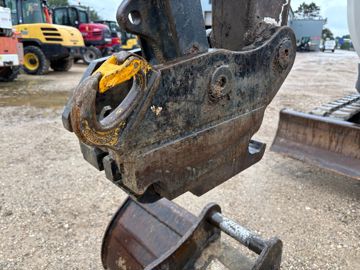 La flèche de la pelleteuse est une des pièces maîtresses méritant toute votre attention. Veillez à ce qu’elle ne présente aucune fissure , et contrôlez son état au niveau des soudures, notamment. N’hésitez pas à démarrer la machine et à secouer le godet afin d’apprécier l’usure des axes. Une machine de 6 000 heures comme la nôtre présentera sûrement un peu de jeu dans les axes. Cette usure est normale et ne contraindra pas vos travaux. Néanmoins, prenez soin de contrôler l’état des flexibles, des tuyaux hydrauliques et des vérins , et assurez-vous plus particulièrement de l'absence d'impacts sur la tige des vérins pouvant, à l'instar de joints défectueux, entraîner des fuites. Comptez entre 300 et 400 € HT pour refaire la jointure d’un vérin en atelier. Attention, le coût varie selon la marque de la pelleteuse. Rapprochez-vous de votre concessionnaire pour un chiffrage précis. L’attelage, lui aussi, est très important, d’autant plus que l'offre du marché est large, avec des marques comme Martin, ACB+ , Klac System, Arden Equipment ou Cangini. Vérifiez sa compatibilité avec les outils fournis . Il existe aussi des têtes d’attelage adaptables de marque ACB+. Celles-ci se soudent sur l’outil et permettent la connexion des deux. S’il s’agit d’un attelage mécanique, demandez à voir la clé, et testez son fonctionnement. Faites de même s’il est automatique, testez-le.