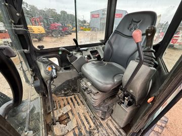 Avant de prendre place au poste de conduite, testez la porte et assurez-vous qu’elle se ferme correctement, tout autant qu'elle reste bien ouverte. Pensez à vérifier la présence et l'étanchéité de toutes les vitres . Si la machine possède une fenêtre défectueuse et qu'elle a, en plus, dormi plusieurs semaines dehors au gré des intempéries, nul doute que surgiront tôt ou tard des problèmes électriques ou, pire, électroniques. Une fois à bord, testez l’ouverture des vitres. Tournez la clé de contact et contrôlez les heures de la machine au compteur . Basculez l’accoudoir de gauche, et essayez toutes les fonctions de la machine , du bras jusqu'à la lame, en passant par la tourelle. Si un outil est dédié à la fonction auxiliaire hydraulique, pensez à contrôler son bon fonctionnement. Faites rouler la pelleteuse, puis aidez-vous du bras pour lever les chenilles l'une après l'autre afin de les faire tourner et de vérifier l’absence de déchirure, comme expliqué dans le paragraphe qui leur est réservé. Autre point important : le siège. Vous y serez installé pendant des heures, alors assurez-vous de son bon état, notamment en traquant d'éventuelles coupures, ainsi que du confort des mousses. Contrôlez le fonctionnement des réglages de l’assise. Enfin, allumez les feux et descendez du poste de conduite pour apprécier l'état de l'éclairage .
