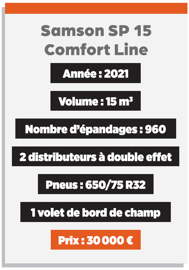 Bien connue pour ses tonnes à lisier, la marque danoise Samson commercialise également des épandeurs à fumier à caisse large ou étroite. Dans notre cas, nous étudions ici un modèle de la gamme SP à caisse étroite et surbaissée. Ces épandeurs se destinent à des petites et moyennes structures. Afin de dénicher la bonne occasion, nous nous sommes rendus chez le concessionnaire Pagot Caput, sur la base de Saône, dans le Doubs, à la rencontre de François Prost, responsable occasion. Il nous dévoile les points à vérifier sur un appareil SP 15 repris récemment à une Cuma située à proximité de la frontière suisse.