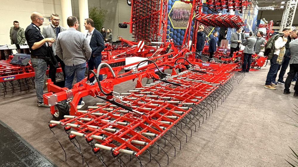 Einböck profitait du salon Agritechnica pour présenter sa herse étrille à dents indépendantes Aerostar-Evo. La gamme se compose de huit modèles, du 300 au 1800, offrant un choix important de largeurs de travail. La plus petite machine pèse 360 kg et travaille sur 3 m, contre 3 070 kg et 18 m de largeur de travail pour le modèle de tête. Notons que ce dernier mesure tout de même 6 m de large en configuration routière, dépassant ainsi le gabarit routier. Ses petites sœurs, une fois repliées, mesurent 3 m de large. Un verrouillage hydraulique sécurise les déplacements routiers à partir du modèle 900, de 9 m d’envergure. Côté conception, les machines sont composées de sections mesurant chacune 1,5 m de large et comportant 48 dents réparties sur six rangées. L’interrang est alors de 3,125 cm. Les dents, de 500 mm de long et de 7 mm de diamètre, peuvent exercer une pression au sol de 4,5 kg grâce à un ressort individuel. Leur orientation est réglable hydrauliquement, avec une présélection manuelle de la position pour chaque compartiment. Pour le transport, leur relevage est lui aussi hydraulique. Des roues de jauge sont présentes de série à l’avant, au nombre de 2, 4 ou 6 selon les modèles, et en option à l'arrière.
