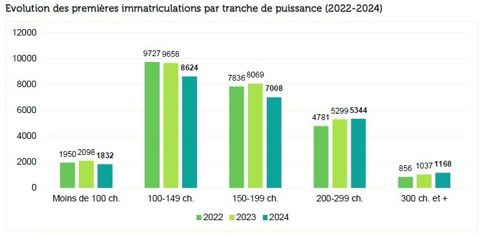 Le segment des 200 à 299 ch reste stable, quant à lui, avec 5 344 immatriculations, soit 45 de plus qu’en 2023. Ce sont les segments de puissance moyenne de 100 à 149 ch et 150 à 199 ch qui sont le plus touchés par la chute du marché, avec des baisses respectives de -1 034 et -1 061 unités. La catégorie des moins de 100 ch se révèle elle aussi à la peine avec une baisse de 266 immatriculations par rapport à n-1.