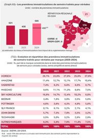 Le marché du semoir à céréale traîné augmente malgré la crise passant de 430 unités en 2023 à 585 en 2024. L’entrée en vigueur de la réglementation sur le freinage est en partie en cause. Dans ce contexte Horsch conforte largement sa place de leader avec 37,9 % de part de marché, contre 25,6 % l’année précédente. Amazone, deuxième, diminue de 7,3 points par rapport à l’année précédente pour atteindre 10,4 % de part de marché. En troisième place, le suédois Väderstad réalise 8,7 % des immatriculations de semoirs en ligne traînés en 2024 (+ 0,1 %). Au pied du podium, l’Italien Maschio-Gaspardo reste en place avec 7,5 % (-2,3 %). Le français Sky-Agriculture descend de la troisième à la cinquième place, perdant 4,2 % par rapport à n-1 pour atteindre 6 % des parts de marché.