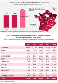 Le marché du rouleau agricole maintient son augmentation, boostée en plus par la mise en application de la norme sur le freinage double ligne avec 1 423 unités immatriculées en 2024, contre 1 060 l’année précédente. Sur ce marché, c’est le Français Quivogne qui reste grand leader, avec un solide 37,7 % de part de marché améliorant sa performance par rapport à 2023 de 3,7 %. Dal-Bo, à la deuxième place perd du terrain mais reste serein, passant de 30,7 % de part de marché en 2023 à 25,9 % en 2024. He-Va arrive troisième avec 10,9 %. Lui aussi connaît une baisse de 1,5 % par rapport à n-1. Au pied du podium, Köckerling bondit de 7,2 %, faisant grimper ses parts de marché à 8,1 %. Razol le suit au classement en représentant 6,7 % du volume de rouleaux agricoles immatriculés. Il est suivi de Kverneland (4,6 %), Agram (3,2 %), Sopema (0,8 %), Väderstad (0,7 %) et Franquet (0,5 %).