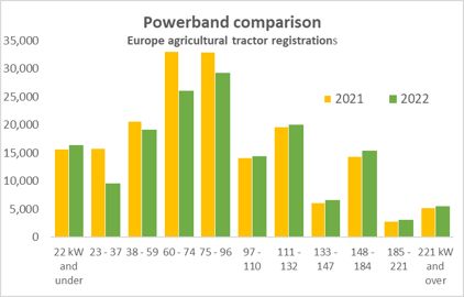 Comparaison des immatriculations de tracteurs selon leur puissance entre 2021 et 2022. ©Systematics International