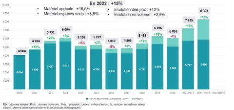 Le chiffre d’affaires du marché du machinisme agricole, qui est désormais comptabilisé avec les serres et les chargeurs télescopiques, a atteint en 2022 un montant record de 8,3 Md€.