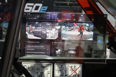 Désireuse de mettre en avant ses développements technologiques, la marque au lynx Bobcat a dévoilé, pour la première fois en Europe, un prototype de chariot télescopique électrique et compact, le TL25.60e. Cette machine est développée dans l’usine française du groupe Doosan Bobcat EMEA Ltd., à Pontchâteau (Loire-Atlantique). Celui-ci a fêté ses 60 ans d’existence en 2023 et affiche une belle dynamique de production avec 40 000 télescopiques construits à ce jour. Ce TL25.60e offre les mêmes performances que son homologue TL25.60 à moteur diesel, avec une charge nominale de 2,5 t, une hauteur de levage de 5,9 m et une vitesse de pointe de 25 km/h. Il possède une transmission hydrostatique et bénéficie de trois moteurs électriques. Sa batterie, d’une capacité de 30 kWh (7 heures d’autonomie annoncées), est à refroidissement liquide. En cabine, l’écran de sécurité transparent affiche, grâce à différentes caméras placées sur l’engin, une vision totale à l'arrière du chargeur et sur le côté, derrière le bras latéral qui, une fois abaissé, occulte la vue depuis le poste de conduite. Lorsque quelqu’un passe devant les caméras, l’écran permet de visualiser, un peu comme un radar de recul sur une voiture, si leur distance par rapport à la machine est dans une zone sécurisée ou dangereuse. La marque étudie avec ses clients l'opportunité de commercialiser ce procédé.