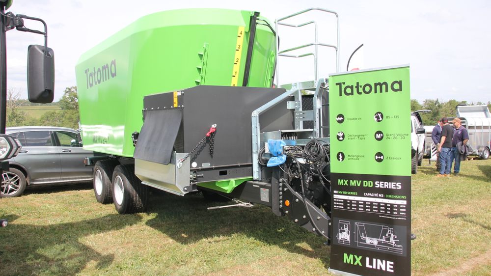 Dans la série des mélangeuses Tatoma à double vis MX MV DD, Tatoma propose trois modèles, de 24, 26 et 30 m3, équipés d’un nouveau châssis évolutif renforcé acceptant les lourds chargements. Afin d’augmenter le débit de distribution, notamment avec des rations fibreuses, le constructeur a doté ces machines d’une porte de 1,2 m de large par 1 m de haut. Le tapis situé à l’avant de la mélangeuse mesure 1,1 m de largeur. L’acheteur a le choix entre une version en PVC et un tapis équipé de chaînes et de barrettes de renfort en inox. Plusieurs options sont également proposées, comme un double essieu boggie suiveur ou une pesée intégrée au tapis de distribution.