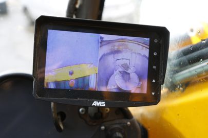 La Lucas G Autospire reçoit un écran tactile en guise de tableau de bord, également utile pour gérer les différentes fonctions de la machine. Celui-ci sert d’interface pour programmer les rations et affiche le poids de marchandise chargée dans la cuve. Le monolevier placé sur la console à droite du conducteur permet de manipuler la fraise de désilage. Assurez-vous du bon fonctionnement de toutes les commandes. Cette automotrice profite d’une homologation pour circuler sur la voie publique, utile dans le cas d’un usage sur plusieurs exploitations. Elle s’équipe donc de feux dont vous vérifierez le fonctionnement. La machine présentée ici accueille également deux caméras. L’une surveille l’intérieur de la cuve, et l'autre couvre l’arrière de la machine. Cet équipement facilite grandement la vie lors des manœuvres. En effet, la visibilité depuis le poste de conduite s’avère plutôt restreinte, en particulier vers la droite, obturée par la présence du convoyeur.