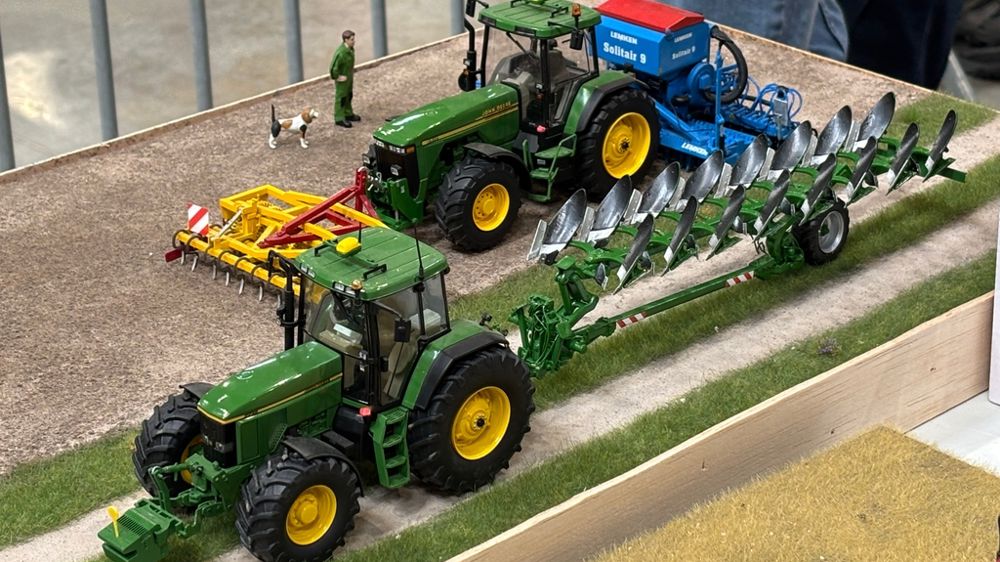 Postée à l’entrée du bâtiment, cette triplette de Renault Atles attirait quelque peu les regards. Ces tracteurs, qui embarquent des moteurs Deutz AG, ont constitué la tête de gamme du constructeur. (© A.G.) John Deere était représenté avec un 8100, un John Deere-Lanz et un 6030. Notons que ce dernier embarque un moteur maison de 8,7 L de cylindrée tout de même. (© A.G.) Qu’est-ce donc que cet engin ? Cette chargeuse sur pneus de la marque Clark Equipment, un constructeur du XXe siècle, fait partie de la lignée des Michigan. (© A.G.) Ce Fendt Xylon repeint prend la pose auprès du mythique Case International 1455 XL. Le Xylon embarque un moteur MAN de 4 cylindres. (© A.G.) Des étendues de miniatures d’occasion étaient présentes sur le salon, comme ce stand où les Renault des séries 51, 14, 54, Ergos ou encore Ares dominaient largement. (© A.G.) Triste événement : ce Massey Ferguson 8220 a traversé le mur du cimetière lors d’une cérémonie d’enterrement. Visiblement, aucun blessé n’est à déplorer. (© A.G.) Ce Renault Ares modifié s’articule. Avec son chargeur, il s'affaire ici à sortir de l’eau une moto, visiblement immergée depuis un bon moment. (© A.G.) Dans ce décor d’un autre temps, le hangar abrite une Claas Mercator ainsi qu’un International de la série 88, s’articulant entre le capot et la cabine. (© A.G.) Les 450 ch du Case IH 450 STX doivent être mis à rude épreuve avec ce Horsh Terrano 8 FX dont une roue est visiblement crevée. (© A.G.) Les pneus de ce John Deere de la série 8R ont été dégonflés afin de limiter la compaction du sol lors des premiers déchaumages avec le Horsch Joker. (© A.G.) Les tracteurs Bima étaient produits en France dans les années 1980. Ce modèle 360 embarque un moteur Aifo de 13 L. Au vu de l’ensemble, ce chantier se déroule sûrement dans la Marne. (© A.G.) Sur céréales, les machines de désherbage mécanique opèrent à la sortie de l’hiver, comme cette houe rotative traînée par un Claas Arion 530 sali par les projections de boue. (© A.G.) Ce John Deere 8310 et son jumelage Somac s'emploient à ouvrir les terres. Notons que les 235 ch du 8,1 L maison ne doivent pas être en trop au regard de la largeur du vibroculteur. (© A.G.) Certaines miniatures faites à la main étaient repérables, à l'image de ce John Deere 7710 et de sa benne Rolland Turbo 160 sur un chantier d’ensilage d’herbe. (© A.G.) Les visiteurs voient rouge avec ce diorama regorgeant de matériels International. Eh oui, le constructeur produisait des presses, des ensileuses traînées ou encore des outils de travail du sol. (© A.G.) Ici, c’est le choc des générations avec un John Deere 7810 à l’épandage de lisier et un Fendt 828 emmenant une benne TP, soit dit en passant faite à la main. (© A.G.) Différentes marques se côtoient sur plusieurs chantiers. Ici, des John Deere, des Fendt, des Case, des New Holland et même un Renault plantent, déchaument, sèment ou transportent. (© A.G.) Les stères tombent ! Ce décor « cosy » présente un Ford TW-30 équipé d’arceaux et d’une pince pour les travaux forestiers. (© A.G.) Ce Fendt 716 de première génération méritant un petit lavage est paré à semer avec un combiné Amazone de 3 m ainsi qu’avec un vibroculteur frontal. (© A.G.) Au col du Haut-Folin, dans le Morvan, loin des grandes cultures, les 195 ch de ce Claas Ares 836 RZ ne vont pas peiner pour traîner le chariot de sapins lors de la récolte. (© A.G.) Triste fin pour ce Deutz-Fahr Agrotron, dont tout l’arrière et la cabine sont brûlés. Quelques pièces sur l’avant du tracteur sont peut-être récupérables. (© A.G.) Ce Fendt 939 et son déchaumeur Lemken Smaragd 9 semblent intervenir dans la Marne, si l'on en croit la craie présente. L’insigne du concessionnaire Bocart sur la cabine le confirme. (© A.G.) Lorsque l’on possède une cour de ferme regorgeant de tracteurs Fendt, l’Audi RS6 est forcément de mise ! (© A.G.) La Claas Lexion 760 vide sa trémie dans une benne Maupu à trois essieux traînée par le mythique John Deere 4955 et son moteur maison de 7,6 L de cylindrée. (© A.G.) Le tracteur tondeuse et le broyeur trahissent l'époque : nous ne sommes pas dans les années 1970 comme pourrait laisser penser la présence du John Deere ou de l’International. (© A.G.) Petit passage chez le concessionnaire local pour ce John Deere 7530 jumelé en roues étroites auquel est attelé un Väderstad Tempo V 12. (© A.G.) Ce décor plus que réaliste présente un vieux corps de ferme avec la maison d’habitation, ainsi que trois bâtiments plus récents abritant grain, fourrage et matériels. (© A.G.) En s’approchant, on remarque que la ferme est équipée en Fendt et que, en plus du stockage à plat, trois cellules accueillent de la graine. (© A.G.) À l'ensilage d’herbe, ce Fendt 930 Vario TMS ne va pas peiner avec sa benne Brimont BB18B, pourtant fort rehaussée. (© A.G.) Le Claas Xerion avait été imaginé pour porter des ensembles d’ensilage, de moisson ou encore d’arrachage de betteraves. (© A.G.)
