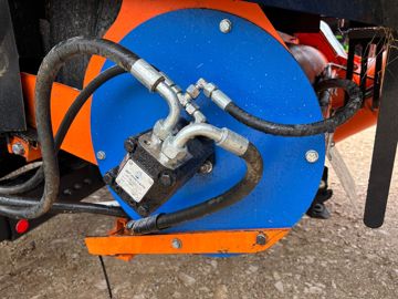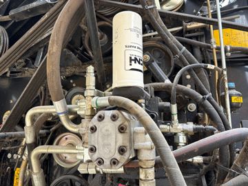 Les deux vis sans fin de transport sont chacune entraînées par un moteur hydraulique. Leur régime de rotation est de 900 tr/min. L’équipement compte une pompe hydraulique montée contre celle de la CX, un réservoir auxiliaire de 80 L d’huile affecté au fonctionnement du circuit hydraulique, un ventilateur et une centrale électrique pour l’alimentation en électricité des capteurs. « Afin de vérifier le niveau d’huile du réservoir, je dois grimper au-dessus de la moissonneuse-batteuse », indique l'agriculteur. En cabine, un boîtier de commande doté de boutons permet la mise en marche et l’arrêt. Il émet également un signal sonore en cas de bourrage, un capteur étant placé dans le récupérateur.
