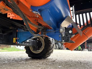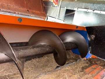 Le fonctionnement du récupérateur Thiérart, positionné juste derrière les grilles de la moissonneuse-batteuse, est relativement simple. Les menues-pailles tombent sur des tables qui les emmènent par gravité à une première vis sans fin horizontale. Cette dernière transporte les menues-pailles vers la droite, jusqu’à une seconde vis qui les achemine vers la goulotte où elles tombent sur l’andain de paille. « Notre récupérateur de menues-pailles nous permet ainsi de les intégrer dans les balles rondes », précise Loris Denizot. Le constructeur Thiérart a lui-même réalisé le montage sur la New Holland, en concession. L’ensemble repose sur un support boulonné sur l’essieu arrière, à la place du crochet d’attelage du chariot de coupe. Ce crochet s'est vu repositionné plus en arrière sur le support du récupérateur.