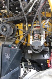 Les turbines, le tapis et le démêleur sont alimentés par un bloc hydraulique positionné à la place du système qui alimente classiquement les éparpilleurs. Leur réservoir hydraulique dédié et le système de refroidissement sont positionnés vers le compartiment moteur de la CR. Le fabricant Thiérart a également retravaillé l’attelage de la moissonneuse-batteuse, constitué désormais d'un crochet déporté sur un petit châssis, pour le rendre plus robuste. La connexion hydraulique s'effectue par des flexibles et prises push-pull. Le timon et les bras d’attelage sont, pour leur part, conçus en cornières en forme de « V » afin d’éviter toute accumulation de paille et de faciliter le passage de la matière sous la remorque. « Dans les virages, il faut être très prudent, car la paille tombe sur les bras et peut rapidement bourrer le tapis PSD qui évacue la matière des rotors. L’idéal reste de battre en ligne droite », prévient Gildas Lecoq.