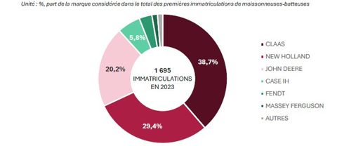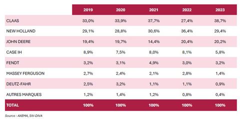 La plus forte progression revient à Claas (38,7 % ; +11,3 points), et New Holland reprend sa deuxième place, perdant 7 points par rapport à 2022. Pour le reste, le marché demeure stable. John Deere conserve sa troisième position avec 20,2 %. Case IH perd quelques points mais conserve sa quatrième place en commercialisant uniquement des machines à rotor axial. Le reste du classement est complété par Fendt, Massey Ferguson et Deutz-Fahr.