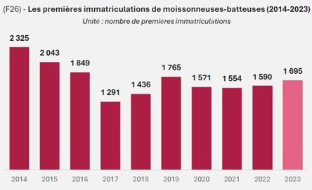 En 2023, les immatriculations de moissonneuses-batteuses en France ont atteint les 1 695 unités, en hausse de +6,6 % par rapport à 2022, soit le plus haut niveau depuis 2016, selon l’Axema. En effet, en 2019 et 2020, les chiffres étaient artificiellement gonflés par la première immatriculation de véhicules anciens.