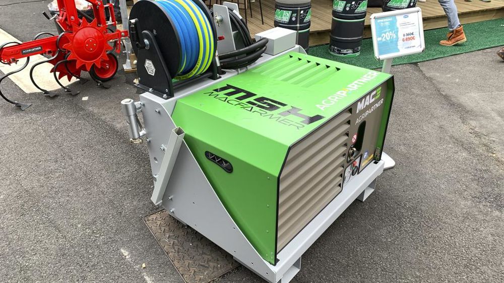 Pour souffler une moissonneuse-batteuse ou une presse à haute densité directement au champ, Agripartner commercialise un compresseur MSH sous la marque Macfarmer, de fabrication française. Cet appareil s’attelle au relevage avant du tracteur et nécessite un distributeur à double effet pour fonctionner. En effet, le MSH est entraîné en pompage continu avec un retour libre selon un besoin minimal de 40 L/min au connecteur hydraulique. Le compresseur génère un débit d’air de 2 600 L/min à une pression de 7 bar. Un enrouleur embarque un tuyau de 20 m de longueur permettant d’atteindre le haut du moteur d’une moissonneuse-batteuse.