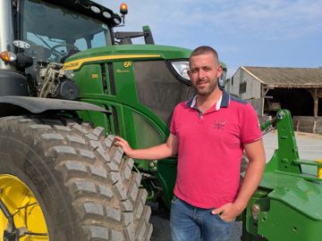 « Depuis mon installation en 2020, j’accorde beaucoup d’importance à la monte de pneus de mes tracteurs, qui sont tous équipés d’un système de télégonflage. En plus du gain agronomique, cela me permet de mieux valoriser la puissance, que je choisis au plus juste en fonction des besoins. Au final, l’argent économisé sur la puissance du tracteur me permet d’investir dans les pneus », raisonne Pierre Colas, agriculteur à Lamballe-Armor, dans les Côtes-d’Armor. En plus de sa ferme en grandes cultures, il dispose d’un méthaniseur et développe une activité de prestations de travaux (épandage, semis et récolte). Ses tracteurs sont ainsi amenés à parcourir de nombreux trajets routiers. « Je me suis équipé de pneus Michelin RoadBib (600/70 R30 et 710/70 R42), que je peux installer sur deux tracteurs, des John Deere 6R 175 et 6R 250, en fonction des travaux à réaliser. »