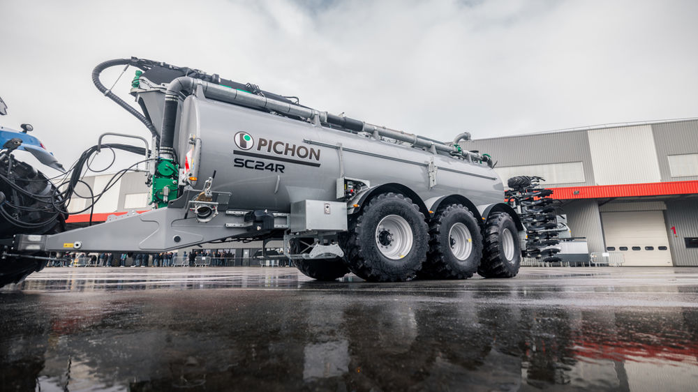 Pichon présente les tonnes à lisier SC se déclinant en deux modèles : la SC24R à trois essieux, de 24 000 L de capacité, et la SC20R à deux essieux, de 20 000 L. La gamme SC hérite de la technologie Samson TG, avec des cuves identiques, peintes en gris, et une pompe centrifuge SC (Slurry Centrifugal). Cette dernière, plus légère qu’un système à compresseur, offre un gain de charge utile. Le modèle SC20R affiche, par exemple, 2,5 t en moins sur la balance que son équivalent à compresseur SV20. Les machines sont dotées d’un bras de pompage latéral à simple ou double articulation.