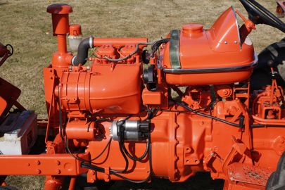 Le capot moteur bascule vers l'avant. Laquées d'orange, la turbine de refroidissement et son carénage dominent sur la dynamo (disposée en avant du moteur) et sur le démarreur. A noter que le corps de cet élément était lui aussi laqué d'orange à l'origine. Les utilisateurs d'un tel tracteur se doivent de vérifier régulièrement la tension de la courroie reliant la poulie du vilebrequin à celles de la turbine et de la dynamo.