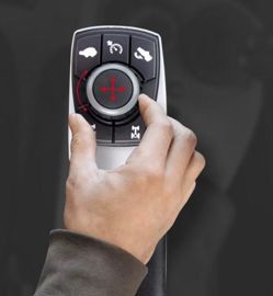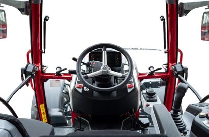 Les commandes au sein de la cabine à six montants du Lintrac 70 sont réduites à l'essentiel. Elles sont regroupées sur un tableau de bord prenant place derrière le volant, un accoudoir, la console de droite et des manettes au plancher, à la droite du chauffeur. La commande rotative LDrive, positionnée en bout d’accoudoir, permet d'augmenter ou de diminuer en continu la vitesse cible d’avancement en tournant simplement la molette. Le conducteur gère ensuite l’avancement à la pédale, à l’aide du pied droit. Quatre stratégies de gestion de transmission sont possibles : Drive, Eco, Power ou Pro. Seule cette dernière est programmable par l’utilisateur, à l’instar de la réactivité du couple moteur-boîte, de la pédale ou encore de l’inverseur. Au sein du poste de conduite, la commande de la transmission LDrive Light prend place au bout de l’accoudoir. (© Lindner)