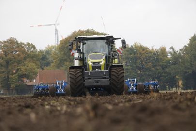 Bon, je suis trop impatient nous reviendrons sur la cabine plus tard. Avant même de commencer à circuler dans les réglages, je pose le déchaumeur à disques indépendants Köckerling Rebell de 12 mètres de large et j’avance dans les résidus de maïs pour voir si ce tracteur en a dans le ventre. Certes, la terre est très légère, mais l’association moteur FPT Cursor 9 de 450 ch et boite à variation continue CMatic montre une belle réactivité pour assumer le pic de charge due à la pose de l’outil. Je fais alors le lien avec la médaille Agritechnica reçue par le constructeur ! Elle lui a été décernée pour son système d’anticipation de la charge. Le tracteur comprend et apprend en effet, de lui-même, que le chauffeur est en train de planter un outil dans le sol grâce aux commandes de relevage ou de distributeurs. Ainsi, lorsque le chauffeur utilise ses commandes le tracteur sait que la charge va augmenter. Il envoie ainsi un peu plus de régime ou adapte la transmission en anticipation. Cette technologie est introduite sur le nouveau logiciel de gestion de la transmission CMatic (fournie par ZF) du tracteur. Celui-ci est désormais développé en interne sur le site de production des transmissions Claas de Paderborn. Je profite que l’équipe Claas aie le dos tourné pour planter l’outil au maximum. Le tracteur s’enfonce doucement dans le sable mais ne sautillera pas. Et ce, malgré l’absence de masse à l’avant. Ceci grâce à la répartition de son poids à 50 % sur chaque essieu, à la suspension du pont avant proactive et à sa monte de pneumatique en R44 de 2,2 m de diamètre à l’arrière. Surtout, il met très longtemps avant de menacer de caler. De quoi largement me laisser le temps d’adapter mes réglages à un passage difficile de la parcelle par exemple. Même constat pour la version à chenilles TerraTrac attelé à un déchaumeur à dents lourd Köckerling Vector de 7 m. Il en a sous le capot et met plus de temps à s’enfoncer.