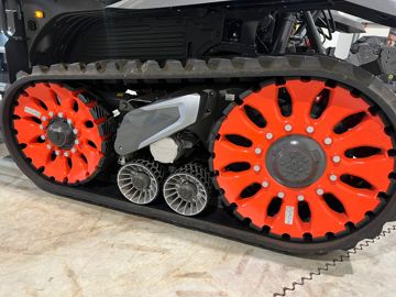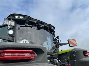 Capot ouvert, le filtre à air est devant les grilles et à hauteur d’homme malgré le gabarit imposant de l’engin et les radiateurs s’ouvrent en portefeuille. Claas m’indique utiliser un système de ventilateur à pales réversibles en option. Pour l’attelage des outils, la manipulation de l’imposant troisième point est assistée par un vérin pneumatique. De série, le tracteur est équipé d’une pompe hydraulique 220 L/min, mais ce débit peut grimper à 370 L/min en option. Deux distributeurs hydrauliques peuvent être équipés de raccords 3/4’’ en option. Sinon ils sont en 1/2’’. Le premier délivrant jusqu’à 170 L/min à la sortie du branchement. Pas de remorques aujourd’hui mais l’équipe du tractoriste me montre son branchement spécial pour automatiser le blocage de l’essieu suiveur. Sur la version à chenilles Terra-trac, je remarque l’arrivée de moyeux transparents pour surveiller le niveau d’huile dans les galets. Présentation terminée, c’est l’heure de monter à bord de la cabine offrant 17 % de volume en plus que l’actuel Axion et une nouvelle ceinture d’éclairage intégrés LED 360 avec des phares de travail d’appoint réglables à LED. Au total, jusqu’à 22 feux éclairent les nuits de travail.
