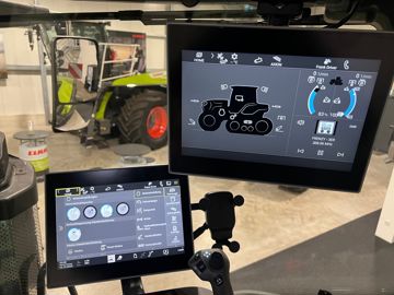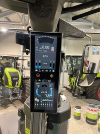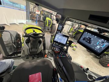 Comme pour le reste des concurrents, il est remplacé par un pavé d’affichage numérique le long du montant avant droit. L’accoudoir change également, avec une ergonomie mieux pensée et des boutons essentiels regroupés devant des fingertips configurables et rétroéclairés. Pour piloter la transmission, le Joystick CMotion reste le même mais est désormais mobile en croix ! Le basculement vers la gauche ou la droite permet de changer de plage de vitesse, toujours au nombre de trois. Claas installe, de série, un monolevier pour l’hydraulique revu. Plutôt ergonomique, il est surmonté d’un joystick en croix. Au total, il offre au minimum 10 commandes configurables et 30 en option. Terminé les potentiomètres sur le montant de cabine. Seule la molette de contrôle de position du relevage subsiste sur le coté de l’accoudoir. Celle-ci me signale d’ailleurs l’arrivée à la position cible du relevage en émettant des vibrations lorsque je joue avec. En circulant dans l’écran en bout d’accoudoir je le trouve plus réactif que sur le tracteur de génération actuelle. C’est parce que c’est devenu en fait un afficheur tactile. Son cerveau est désormais intégré à la cabine. Ceci à un deuxième effet positif. Plus besoin d’avoir deux écrans pour utiliser le GPS !