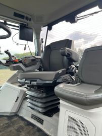 En effet, le deuxième écran n’est plus le Cemis et n’est plus réservé à l’isobus ou à l’autoguidage. Il s’agit juste d’un deuxième afficheur. Les deux sont capables de contrôler l’ensemble des fonctions. Le menu principal est bien entendu configurable à souhait. Pour ce qui est de l’interface, pas de révolution, c’est clair, on s’y retrouve. Créer une ligne de guidage est simple et atteindre ses réglages est facilité par des raccourcis. Trop excité de rouler j’ai oublié de régler mon siège. Il est temps de le faire. Ici dans sa version la plus haut de gamme l’ensemble des réglages est électrique. Il est possible d’en enregistrer trois. Tiens, même le compresseur de la suspension du siège est dehors, du bruit en moins donc. Ce siège de la marque Isri est chauffé et ventilé. Il est au choix en cuir ou en tissu. Il pivote de 40° vers la droite et de 10° vers la gauche.
