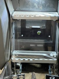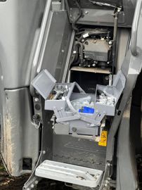 Je retrouve également une prise d’air pour soufflette, la batterie et ses causses. Toujours autour de l’escalier, un bouton permet d’allumer l’éclairage du tracteur afin de voir son environnement dans le noir par exemple et d’arrêter d’utiliser le flash du téléphone. Même l’escalier et la caisse à outils bénéficient de leur éclairage LED. L’opérateur peut régler, depuis l’écran, quels phares s’allumeront à l’appui sur ce bouton. Pratique, mais ce n’est pas sa seule fonction. En effet, ce dernier met également en route le terminal du tracteur afin d’accéder aux réglages dès le démarrage. Le seuil de porte de 43 cm me laisse largement assez d’espace pour pénétrer confortablement.