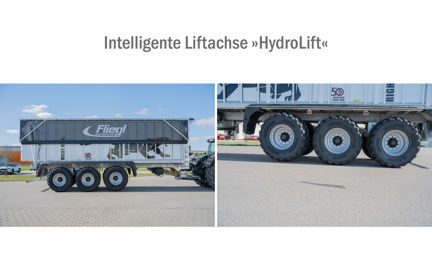 Fliegl présente un essieu relevable pour ses remorques tridem baptisé « HydroLift », dont la position s’adapte automatiquement à la charge. Pour cela, il a intégré un capteur de charge à la suspension hydropneumatique du timon. En cas de surcharge, le premier essieu s’abaisse automatiquement afin d'apporter plus de stabilité et de mieux répartir la charge. Le système HydroLift est efficace même pour des charges asymétriques, comme cela peut être le cas avec les épandeurs à fumier. Pour éviter le relèvement involontaire de l’essieu lorsque la charge diminue, par exemple lors du déchargement ou dans les pentes, les mesures sont prises sur un temps donné en vue d'éliminer les potentiels pics de pression courts ne correspondant pas à la charge réelle. Le relèvement de l’essieu est aussi possible manuellement en cabine. En cas de coupure de courant, l’essieu s’abaisse automatiquement pour évoluer en sécurité.