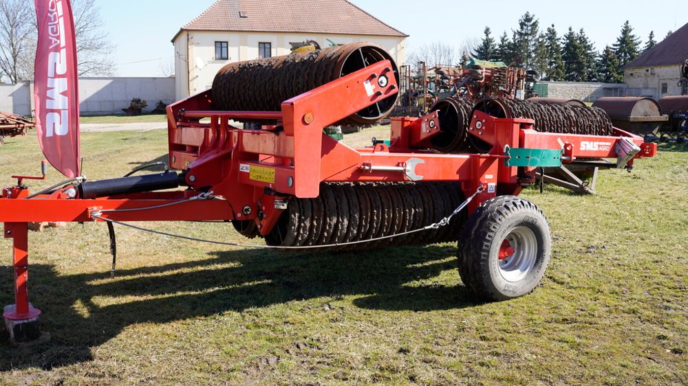 SMS Agro propose le rouleau Teran, dont le châssis se compose de 1, 3, 5 ou 7 sections, selon la largeur de travail, comprise entre 3 et 16,2 m. La particularité de cet outil réside dans sa capacité à suivre le relief irrégulier du sol grâce à des articulations permettant une grande amplitude de débattement. Des lames de ressort disposées au-dessus des points de pivot garantissent la répartition homogène de l’appui sur les sections. Le rouleau s’équipe de disques en fonte de type Cambridge de 510 ou 610 mm de diamètre, de disques en « Z », adaptés aux prairies, ou de billes lisses. Il reçoit en option un semoir de petites graines, doté d’une trémie de 200 à 500 L.