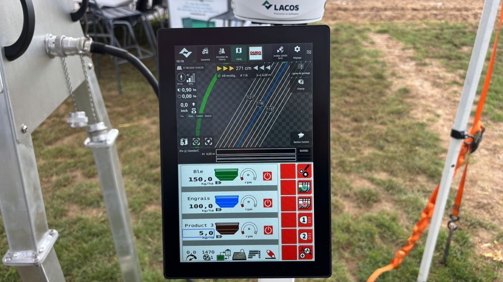Le Français Duro dévoile l’i-Control 2.0 pour ses trémies frontales Eole. Nouvel écran, nouveau logiciel : l’électronique se refait une jeunesse en partenariat avec le spécialiste Lacos. La nouvelle gestion électronique implique des pièces supplémentaires, à l’image du capteur de turbine et des trappes de compartiments désormais commandées électriquement. Les trémies frontales peuvent à présent bénéficier de la coupure de demi-largeur et de l’étalonnage des doseurs depuis l’extérieur. Pour plus d’ergonomie à l'usage, chaque compartiment est dorénavant représenté sur l’écran. Dans le cas d’une utilisation pour une seule culture avec tous les compartiments remplis, l’i-Control 2.0 adapte électroniquement les réglages pour fonctionner comme une trémie simple. Enfin, les feux de l'Eole disposent maintenant d’un « code-phare » pour une utilisation sur la route, en plus du mode champ. Cette commande est également accessible depuis l’écran.