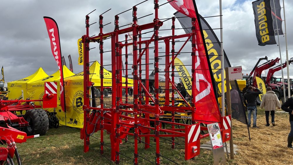 Le fabricant français Agram présente sa herse à paille Géo Straw. Ce modèle est proposé en deux largeurs, de 7,5 et 8,4 m, dotées respectivement de dents de 14 et 16 mm. Ces dernières sont reparties sur cinq rangées et disposent d’une agressivité réglable hydrauliquement. Les roues de jauge, de série sur le plus gros modèle, sont disponibles en option sur celui de 7,5 m. La herse Géo Straw est munie d’un support permettant l’installation d’un semoir pneumatique Jet Sem, idéal pour le semis de couverts végétaux ou de prairies.